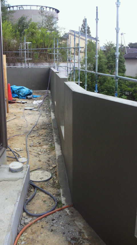 N氏から写真です。 本日、現場では電動シャッター、鋳物フェンスが取りつけられています。 でかーい電動シャッター。 下部は目隠しになっており、上部はステンレスパイプ。 この大きさが電動で動くのはスゴイですよ。