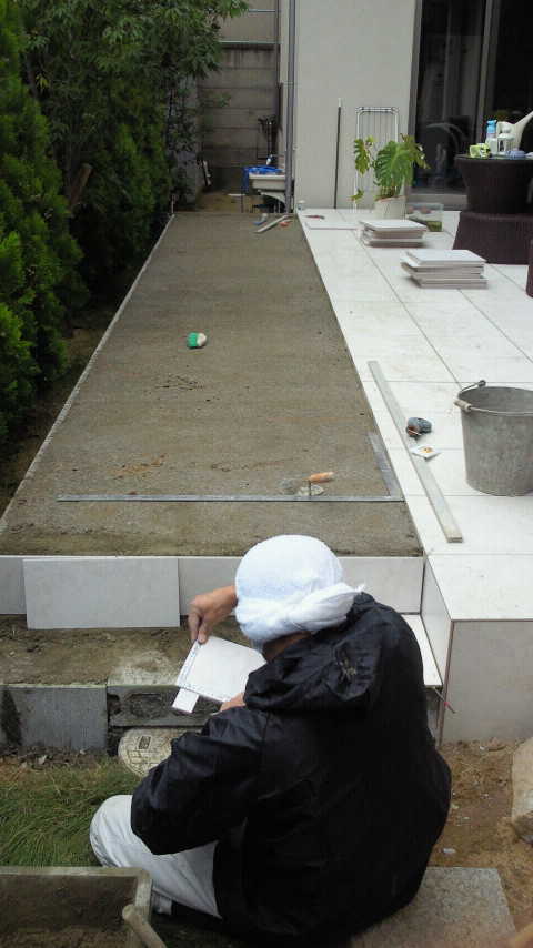そんな中、南向きのお庭にあるタイル貼りのテラスを1.2m大きくする増設工事をさせていただいております。
