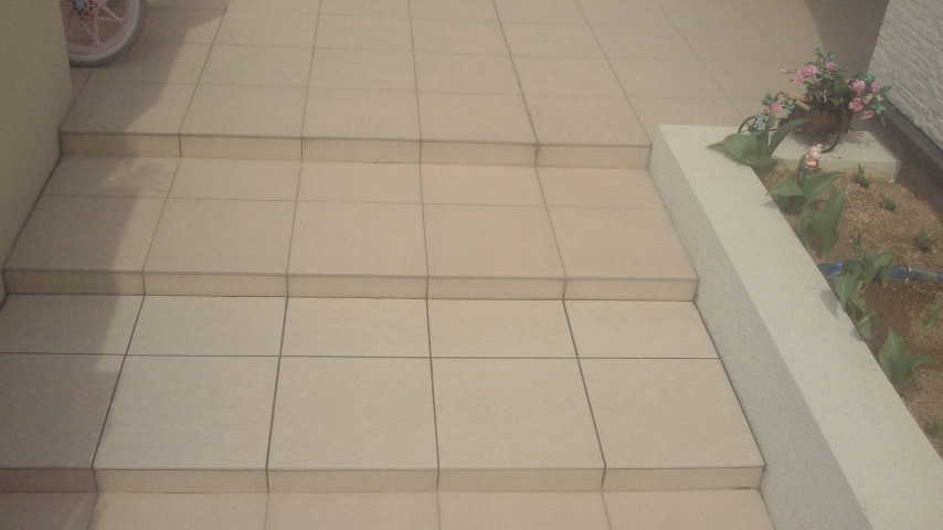 と言う事で、階段に横たわっているホースをタイル下に埋設する作業をさせていただきました。