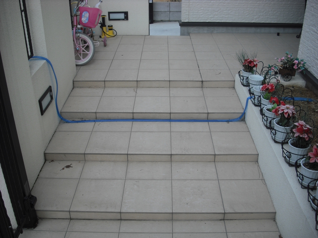 玄関からのタイル貼り階段の途中で門柱の外側の植え込みにも水が行くようにホースが横たわっていました。