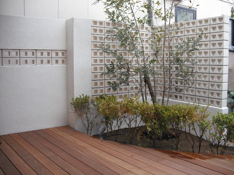 この白い壁面に囲まれた内側にウッドデッキ。