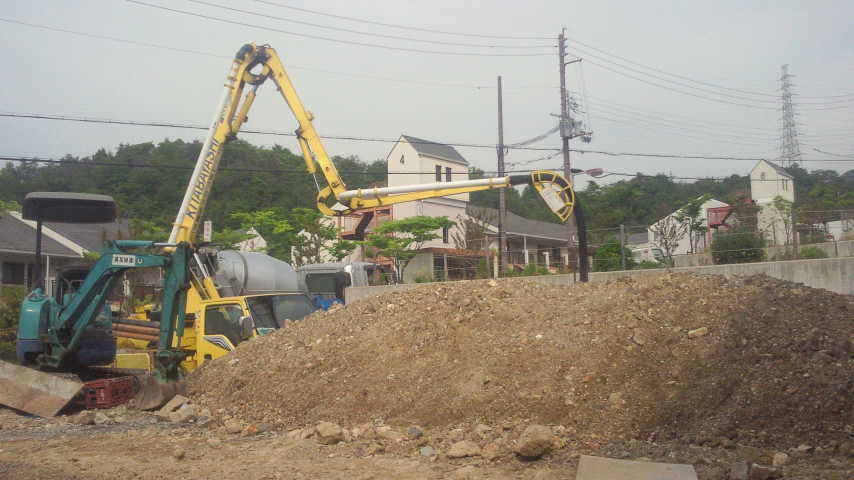 ながーいアームの車輌が、コンクリートを遠くに流し込む車輌です。ポンプ車と呼んでいます。