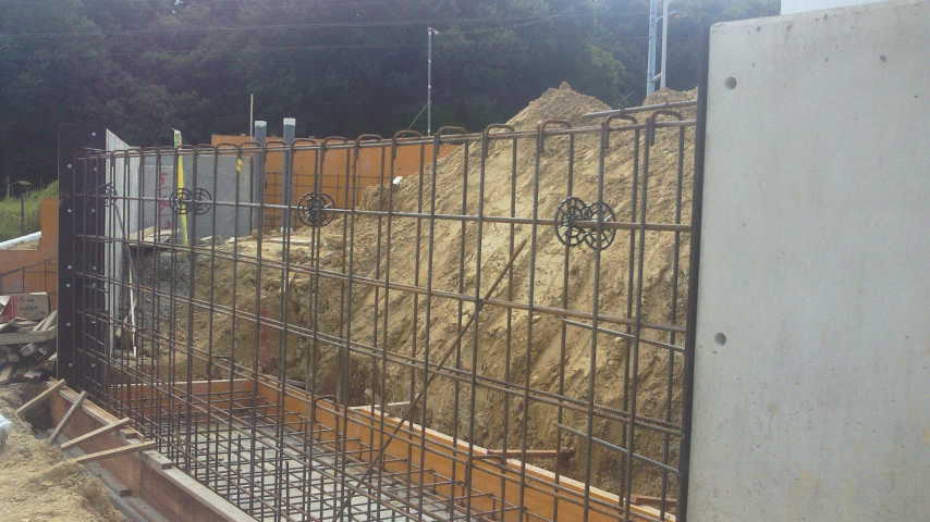 擁壁ができあがりましたら、どーっと埋め戻すための土が裏に見えていますね。