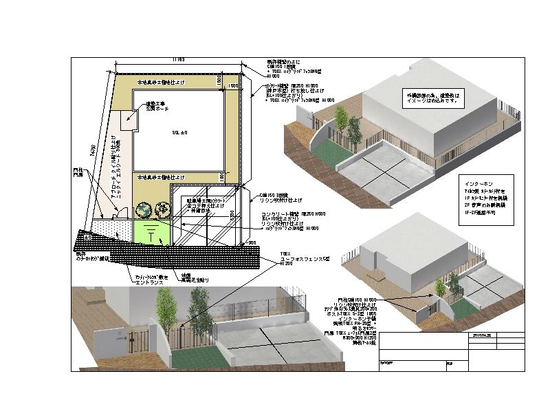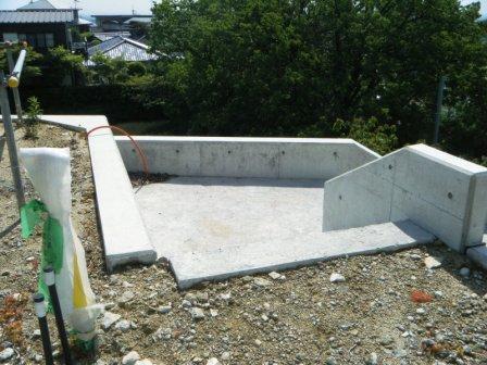 こんな感じとこんな感じであります。今回は前面道路に少し勾配がありますので、コンクリート擁壁を一部使っております。神戸市においてコンクリート擁壁をするには、断面図によって細かな指示があります。神戸市のその指示にのっとって、鉄筋の配筋などをする必要があります。なにげにあるコンクリートの壁も、中身は適切に鉄筋が配られていると言ったところです。