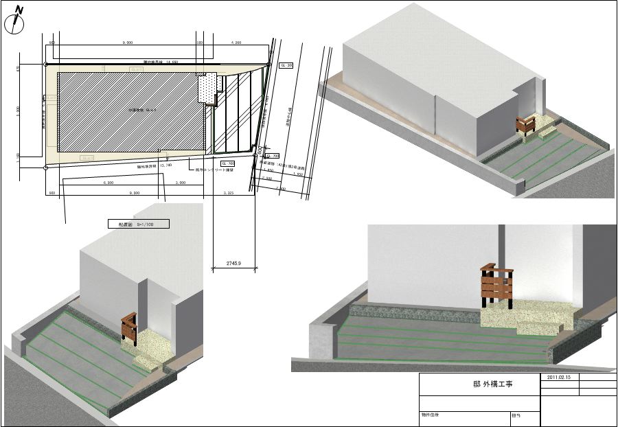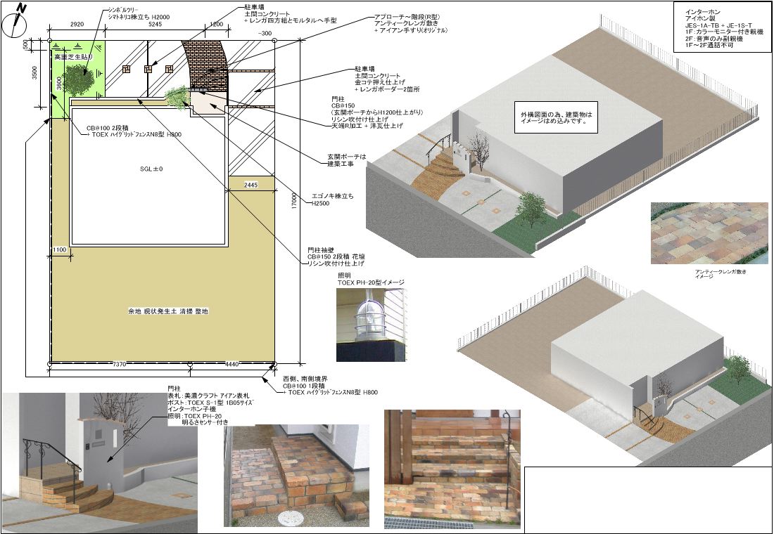 いっしょうけんめいプランをさせていただいております。洋風がお好みということでしたので、それなりに雰囲気のあるエクステリアをめざして作図いたしました。