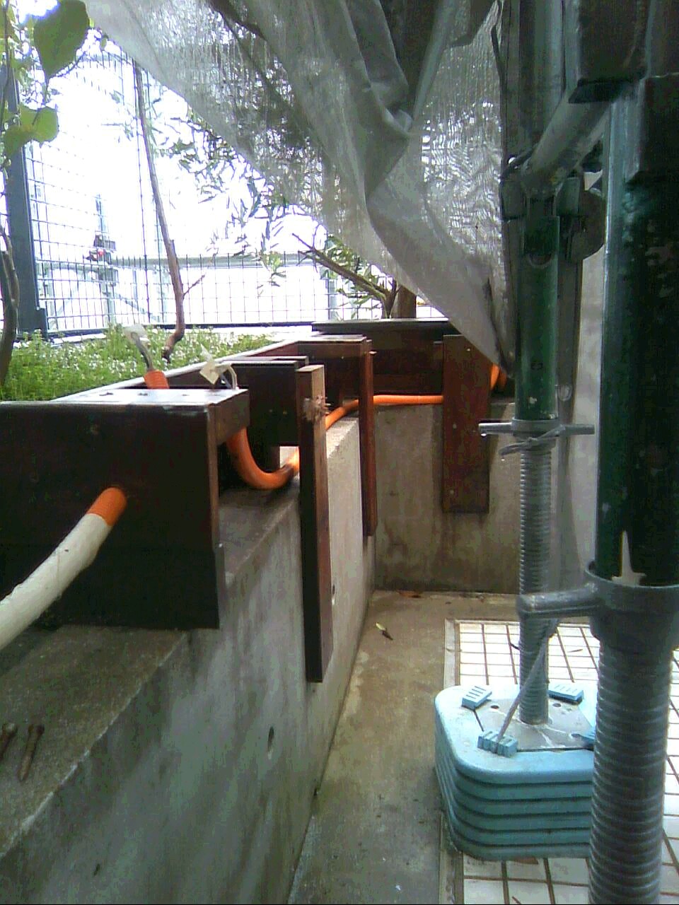 でも、ウッドデッキ施工当時から、マンション全体をいずれ再防水する事も聞いていましたので、このデッキ、分割できます。まんなかで2つに分かれて「すのこ」状態で持ち上がります。が、重いですけどね。イペは水に沈むぐらい圧縮されているような板ですので、めちゃ重いです。