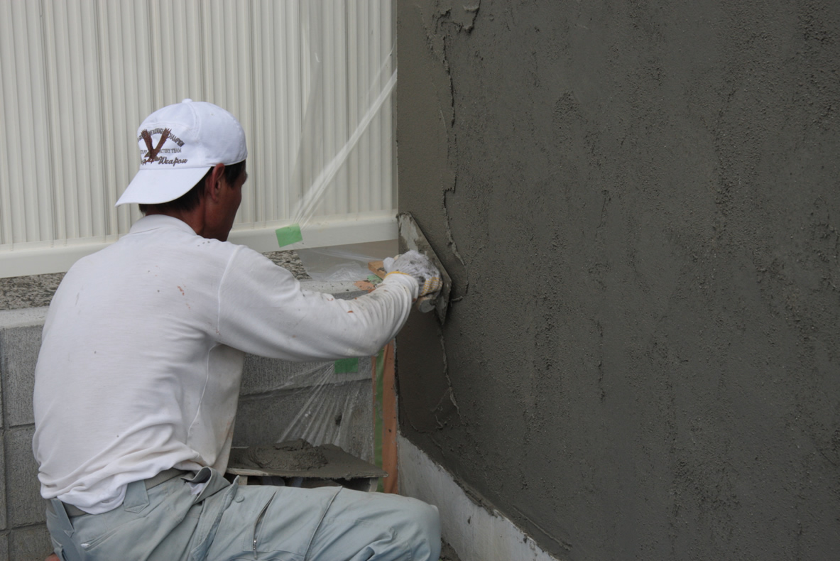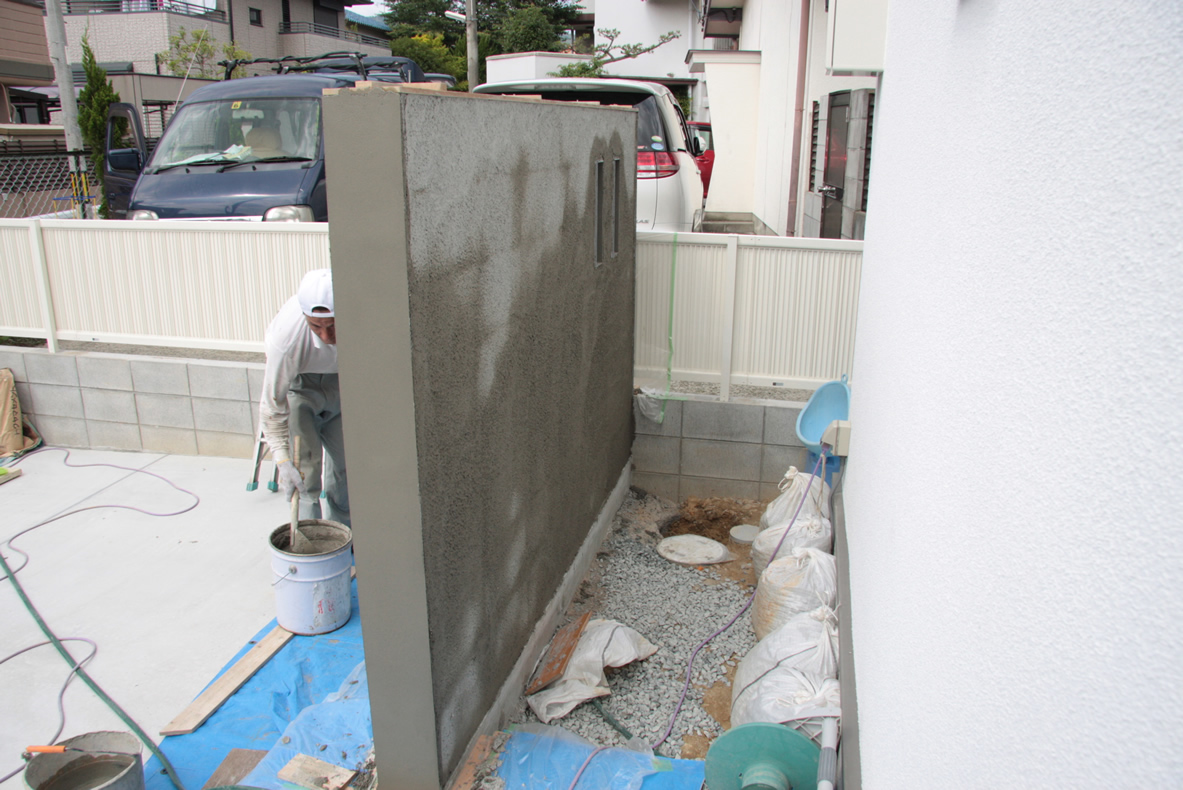 なかなか一枚の壁を作るにも手順が多いでしょ。基礎工事、ブロック積み、下地左官、仕上げの吹き付け。
