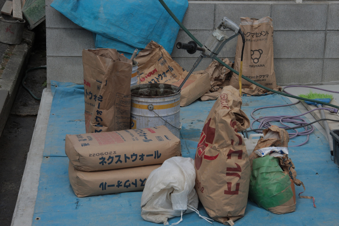 下地と言いましてもこれだけの材料を特殊にミックスして配合したモルタルを塗る。これ知識と経験と技術。