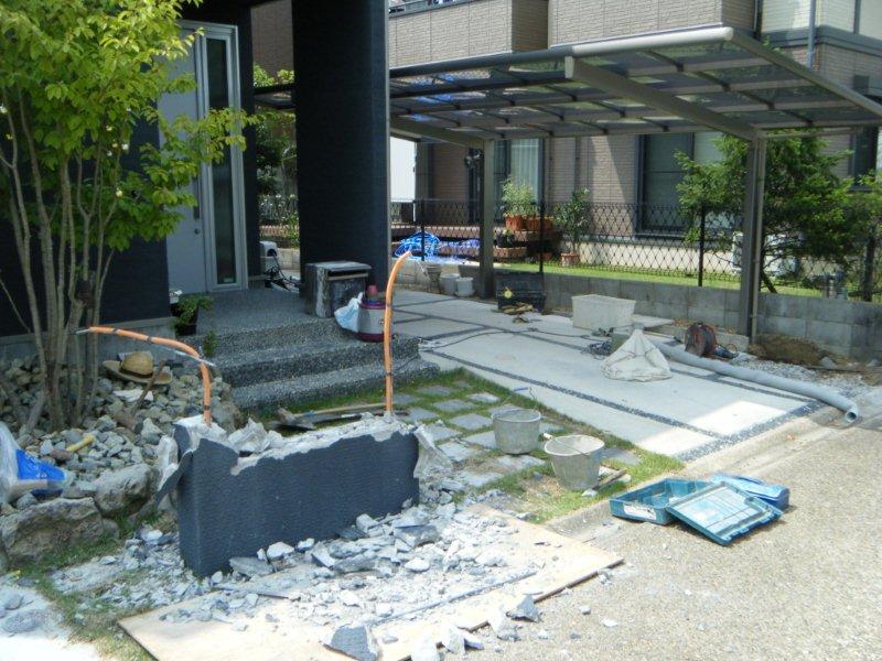 エクステリアの工事は初日はどうしてもこのようにガラっぽくなってしまい、つぶし作業が中心です。