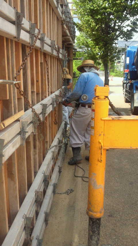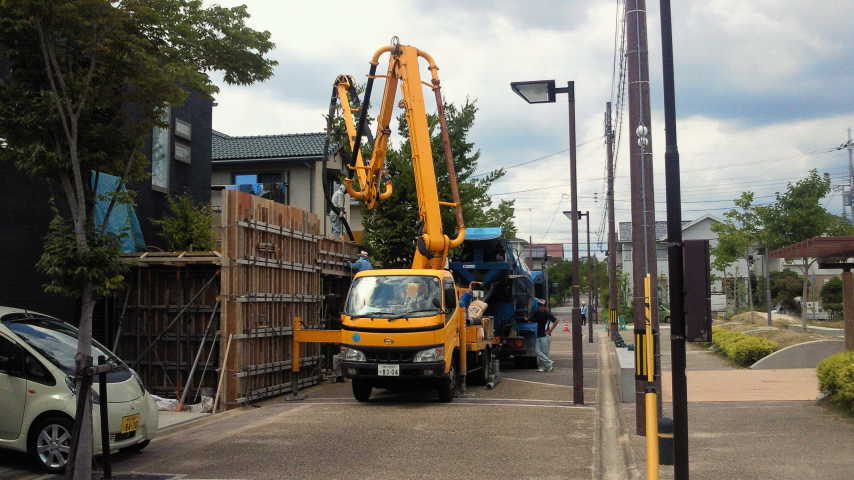 そんな暑いさなか、現場ではコンクリートを流し込む作業が展開中。黄色い作業車はポンプ車と言って、コンクリートを上から流し込む時に送り込むための作業車です。