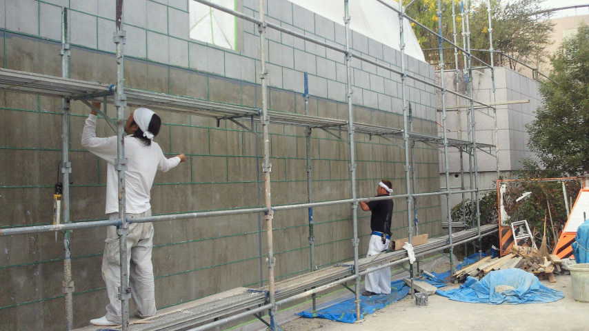 吹き付け屋の親分、Aじさんが目地を描いて行きます。