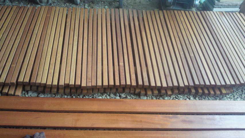 ウッドデッキ材を1/3に縦割り。