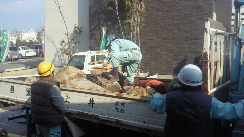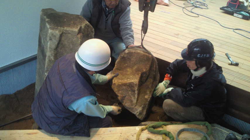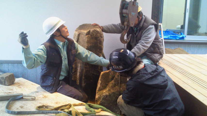 今日はその展示場にて大きな景石を設置しています。景石ってのは、自然石を配置してその姿を見ていただく飾り石のことですね。