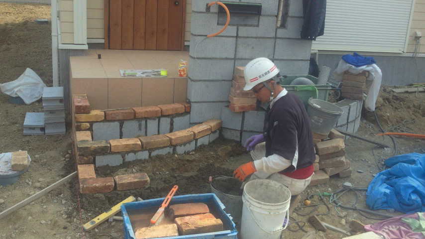もう一か所。芦屋市A様邸にてレンガ組み中のいそおさん。