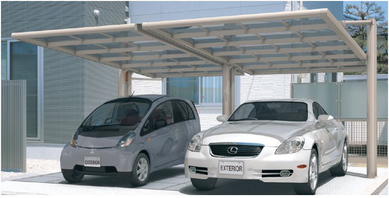 2台分の大きな屋根を左右の太い柱で持たせています。