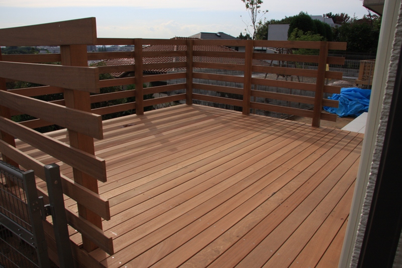 手前はそのデッキに繋がるタイル貼りのテラス。