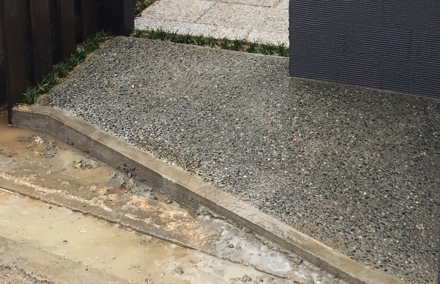 土間コンクリート、洗い出し、きれいに仕上げないと固まる。