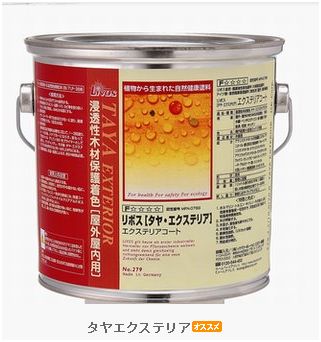リボスのタヤエクステリアと言う塗料。板の通気性を損なわずに防水性を持たせて耐候性を持たせる。